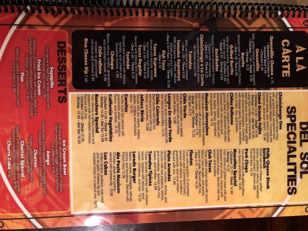 Del Sol’s menu is encyclopedic, featuring items across various categories. Diners can explore everything from traditional tacos to innovative vegetarian options. Signature dishes include colorful fajitas and hearty burritos.